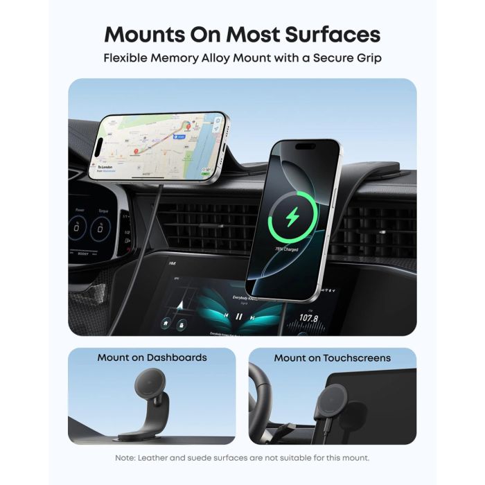 Magnetna sila 16 N zagotavlja stabilen in varen oprijem telefona tudi na zelo razgibanih cestah. Avtomobilski 3M lepilni trak nudi močno in dolgotrajno vez, ki preprečuje, da bi se nosilec odlepil. - Združljivost z MagSafe in univerzalnimi napravami