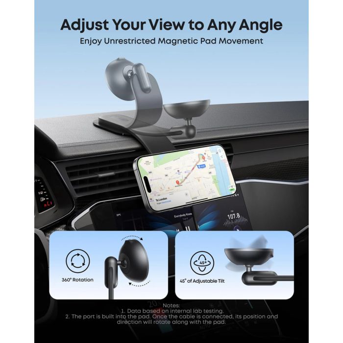 Zasnovan z nosilcem iz spominske kovinske zlitine, ki se prilagodi ukrivljenim armaturnim ploščam in zaslonom na dotik. Upogne se do 180° ter vključuje magnetno blazinico s 360° vrtenjem in 45° nagibom, kar omogoča enostavno nastavitev idealnega kota za brezskrbno uporabo brez rok. - Stabilen oprijem tudi na zahtevnih cestah